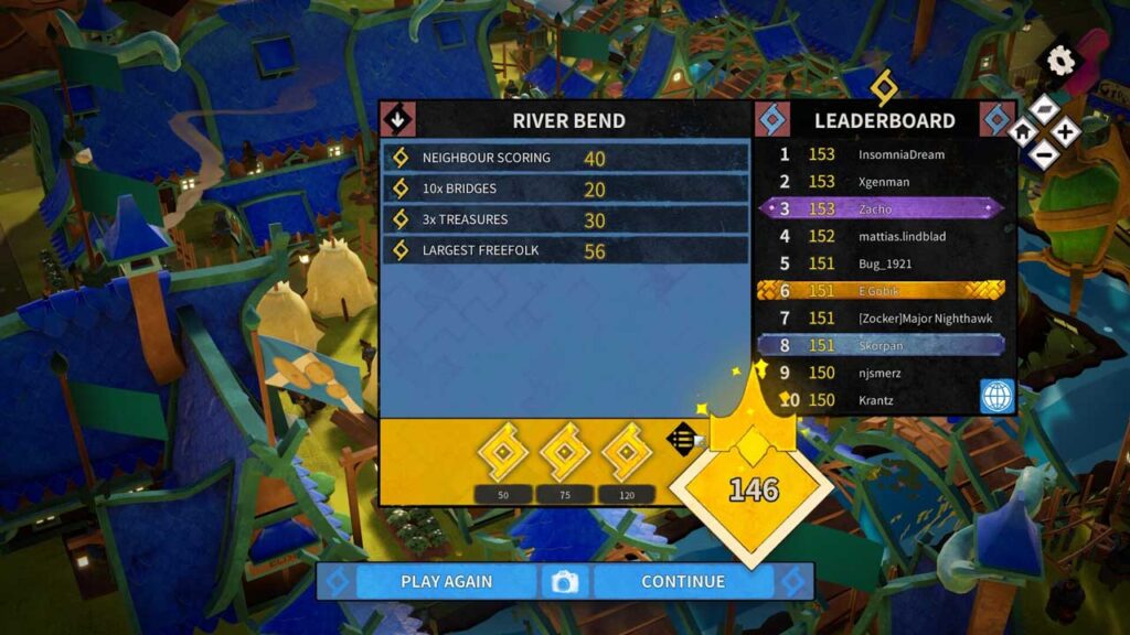 পথে, আপনাকে আরও পয়েন্ট অর্জনের জন্য গাছগুলিকে ঘিরে ব্লক ব্যবহার করতে হবে, সোনার খনি দখল করতে হবে এবং আরও অনেক কিছু করতে হবে। আপনি যখন প্রয়োজনীয় স্কোরে পৌঁছাবেন (সর্বোচ্চ তিন তারকা) তখন আপনি স্তরটি অতিক্রম করবেন। প্রতিটি স্তর আপনাকে একটি নির্দিষ্ট আকৃতির নির্দিষ্ট সংখ্যক ব্লক প্রদান করে। প্রধান চ্যালেঞ্জ হল ব্লকগুলি খেলোয়াড়দের এলোমেলোভাবে দেওয়া হয়, তাই আপনি যদি উচ্চ স্কোর পেতে চান, তাহলে সেগুলি রাখার আগে আপনাকে সাবধানে চিন্তা করতে হবে। সর্বাধিক প্রতিযোগিতামূলকদের জন্য প্রতিটি স্তরে পয়েন্টের উপর ভিত্তি করে একটি র্যাঙ্কিং সিস্টেমও রয়েছে এবং প্রতিদিনের চ্যালেঞ্জগুলিও উপলব্ধ।