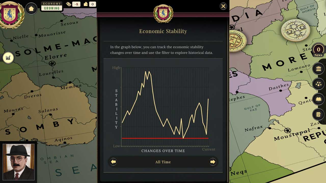 ফলস্বরূপ, গেমটি বাস্তববাদী সিদ্ধান্ত গ্রহণকে জোরালোভাবে উৎসাহিত করে, আপনাকে সর্বদা সাবধানে চলতে এবং দীর্ঘমেয়াদী, আন্তঃসংযুক্ত দৃষ্টিভঙ্গি বিবেচনা করতে উৎসাহিত করে। এভাবে, এটি নির্বাহী ক্ষমতার একটি অসাধারণ কার্যকর অনুকরণ। প্রতিটি পছন্দের স্বল্পমেয়াদী এবং দীর্ঘমেয়াদী পরিণতি রয়েছে – যা তোমাকে বাস্তববাদী রাজনীতি সম্পর্কে খুব দ্রুত ভাবতে বাধ্য করে।