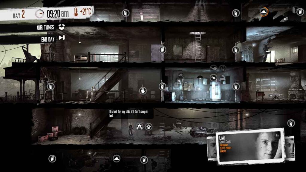 এই গেমটির গল্পটি কোনোভাবে গেমপ্লেতে অন্তর্ভুক্ত করা হয়েছে এবং আইটেমগুলির একটি সিরিজ সংগ্রহের মাধ্যমে বলা হয়েছে, যাতে আপনি যখন কিছু আবাসিক বাড়িতে খাবার এবং জল খোঁজার জন্য অক্ষরদের আশ্রয়ের বাইরে পাঠান, তখন আপনি নোট পাবেন যা আরও ব্যাখ্যা করে। গল্পের বিষয়বস্তু এবং গেমে আপনাকে অগ্রগতি করতে। খেলার পরিবেশের বিষণ্ণ চেহারা একটি গুরুত্বপূর্ণ ঘটনার অনুভূতি জাগিয়ে তোলে এবং এক কথায় খেলোয়াড়দের জন্য মৃত্যু, যে ধারণাটি গেমপ্লে চলাকালীন যতটা সম্ভব সম্পূর্ণরূপে বর্ণনা করা হয়। গেমটির পরিবেশের একটি উচ্চ বৈচিত্র্য রয়েছে এবং উদাহরণস্বরূপ, আমরা স্নাইপার শত্রু, পরিত্যক্ত বাড়ি, হাসপাতাল, যার সবকটিই চমৎকার গ্রাফিক্স এবং গেমের চমৎকার গল্পের সাথে সমন্বিত একটি ডক উল্লেখ করতে পারি।
