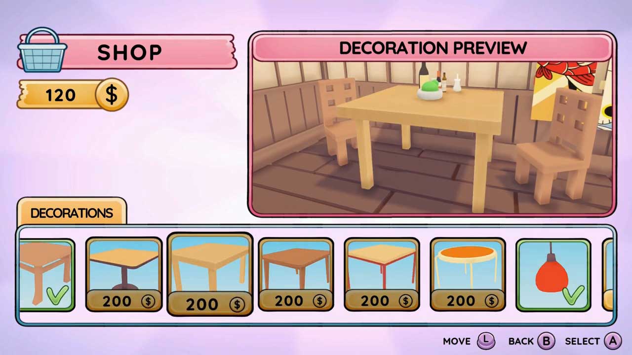 আপনি নিজের রেসিপি তৈরি/ডিজাইন করতে পারবেন না, পরিবর্তে আপনার কাছে একটি রেসিপি বই থাকবে এবং পরিবেশন/রান্নার মাধ্যমে জ্ঞান অর্জন করতে পারবেন। এই টিপস আপনাকে নতুন খাবার “গবেষণা” (আনলক) করতে দেয়। যাইহোক, আপনি যদি পর্যাপ্ত খাবার তৈরি করেন তবে এটি একটি উচ্চ স্তরে আপগ্রেড করা যেতে পারে। সারাদিনে চ্যালেঞ্জও থাকবে যা আপনি অতিরিক্ত নগদ দিয়ে সম্পূর্ণ করতে পারবেন। এগুলি সাধারণত সময়-সীমিত। কিছু আপনাকে পরের দিন করতে হবে, কিছু কিছু দিনের মধ্যে। প্রতিটি দিনের শেষে, আপনি আপনার ল্যাপটপে অ্যাক্সেস পাবেন যেখানে আপনি আপনার অবস্থানের জন্য কিনতে পারেন এমন সরঞ্জামগুলি অনুসন্ধান করতে পারেন৷ নতুন চেয়ার, টেবিল, গাছপালা এবং খাবার উপভোগ করুন।